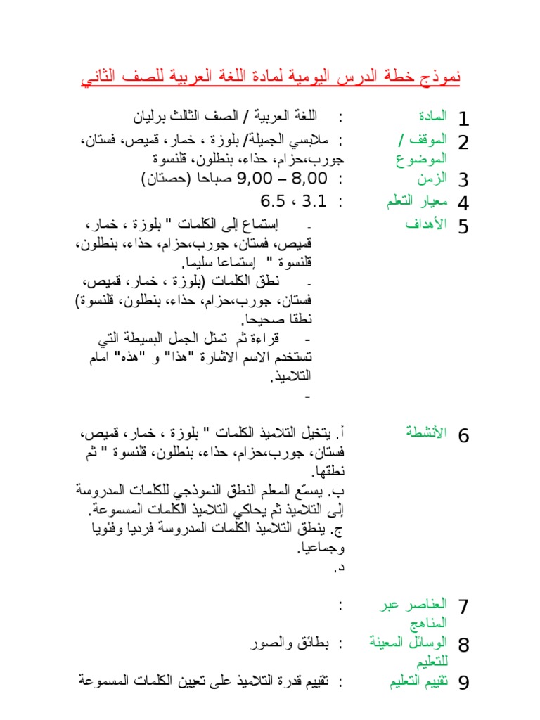 نموذج خطة الدرس اليومية لمادة اللغة العربية للصف الثاني