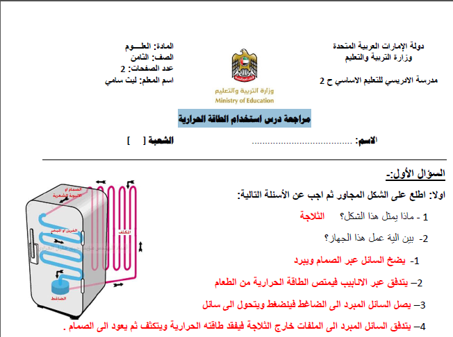 مراجعة درس الطاقة الحرارية ودرجة الحرارة والحرارة مع الإجابات علوم فصل أول صف ثامن مدرستي الامارتية