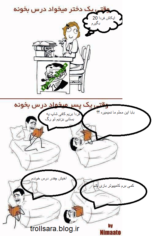 درس خوندن دخترا خنده دار. طنز نحوه درس خوندن دخترا و پسرا. موقع درس خوندن پرزهای موکت هم واسه آدم جذاب می شه دوست داری ساعت ها بشینی بهشون نگاه کنی. و حالا اصل مطلب.